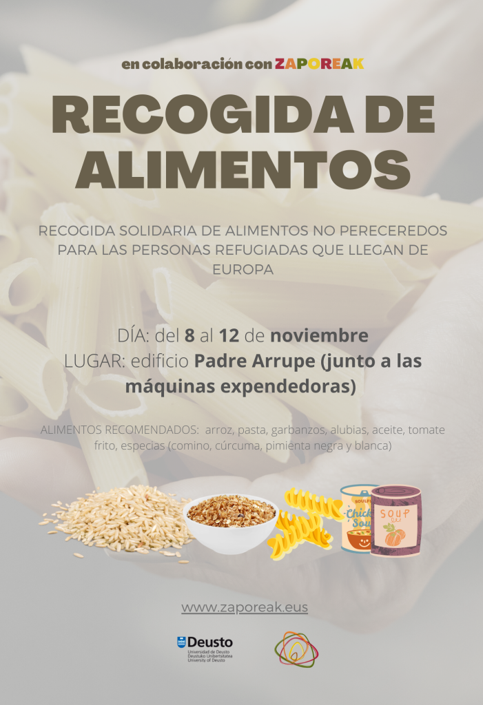 Durante esta semana, del 8 al 12 de noviembre, un grupo de alumnos de segundo curso organizamos una recogida de alimentos junto a las máquinas expendedoras del edificio Arrupe. Esta recogida de comida está organizada con la intención de apoyar a la asociación Zaporeak, que forma parte de un proyecto llevado a cabo en la asignatura de Gestión y Organización de Empresas.